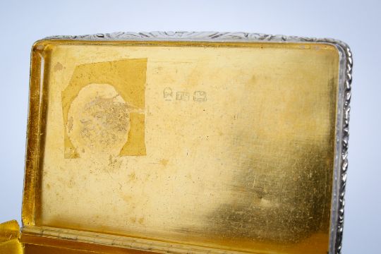 A Georgian silver snuff box. Engraved 'John Thompson' to the lid within patterned borders, gilt to the inside, hallmarks for TS, Birmingham 1830. H2.3cm x W5.5cm x DD2.1cm, weight 145g.
