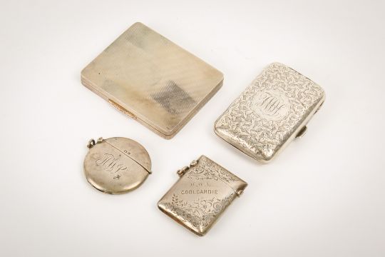 Four Victorian and later small hallmarked silver cigarette and vesta cases. The largest with engine turned decoration and gilt handle, gilt to the inside, 0.9cm x 8cm x 6.5cm, London 1936; a small case decorated with leaves and central engraved monogram, Birmingham 1896; together with a round vesta case and a rectangular example, both named. Gross weight 209g.
