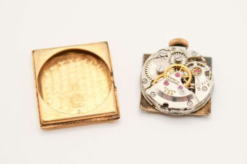 A 9ct gold Rex lady's cocktail watch. Gilt markers to the square cream face, hallmarked inside back case, case size 1.9cm x 2.8cm, on a chain link strap, hallmarked to clasp, with security chain. Gross weight 28.8g