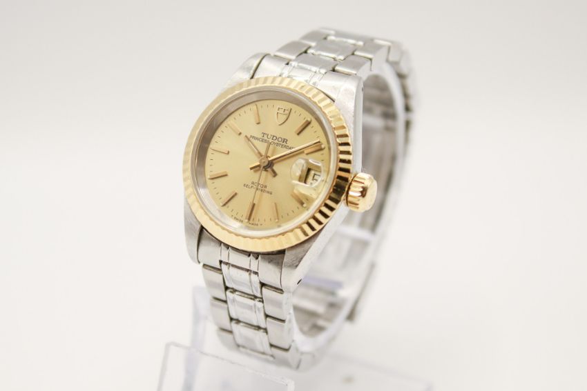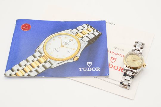 A lady's Tudor Princess Oysterdate stainless steel wristwatch, With gold face and date aperture, self-winding, in a bi-colour case, the bracelet strap