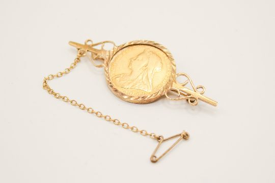 An 1896 gold sovereign coin mounted as a brooch in 9ct gold. The brooch hallmarked, with security chain, gross weight 11.5g.