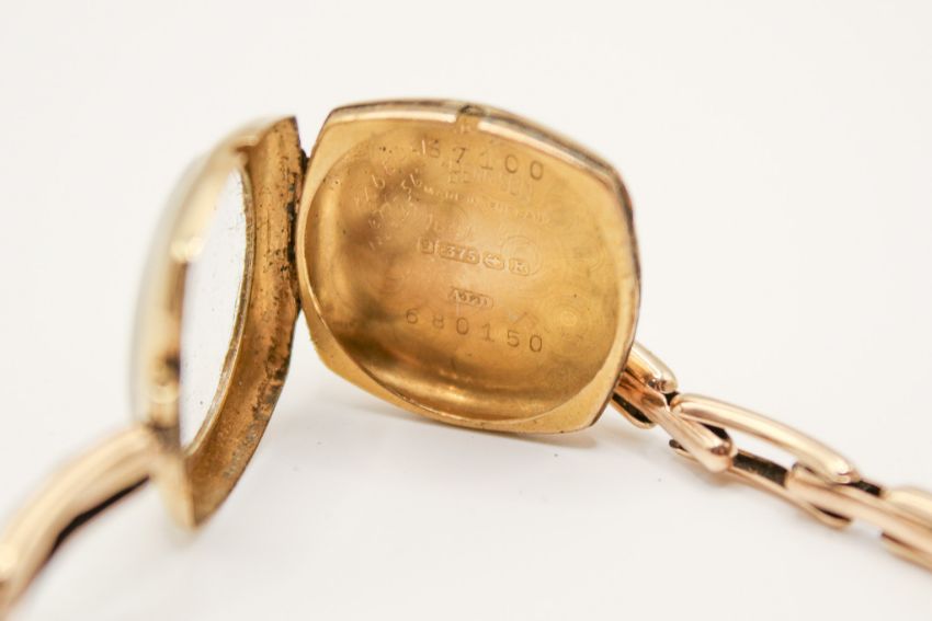 A 9ct gold cased lady's vintage Hirco wristwatch. Gilt Arabic numerals to the cream face, 15 jewels, inside back of case hallmarked and marked Dennison, elasticated bracelet strap, this engraved 9ct Britannic and tests as 9ct, gross weight without movement 8.4g.