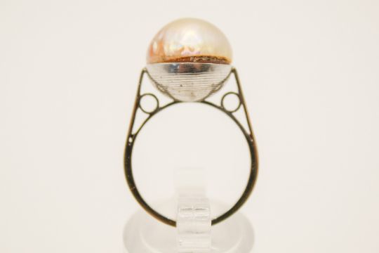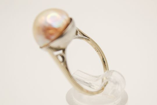A 9ct gold cultured pearl ring. The pearl circa 12mm diameter, in a dish mount, marked 9ct. Size O, gross weight 4.1g.