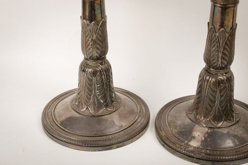 A set of four early 19th century French silver candlesticks. Of tapering form, decorated with bands of beading and leaves and central acanthus leaves border, variously marked to candlestick and drip tray with Minerva 1 head, Paris large object mark, rooster 1, and medium object head mark. H32.2cm, gross weight 4240g. Condition Report: Overall in good-very good condition. Some minor dents and uneven section around the bases (possibly part of the manufacturing process). Some areas of tarnishing and wear including scratches and wax condisitent with age and usage. No significnat dents or repairs. Stand straight and firm. No rubbing to the hallmarks or decoration.