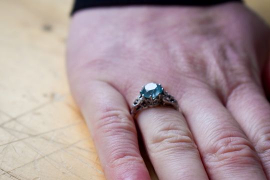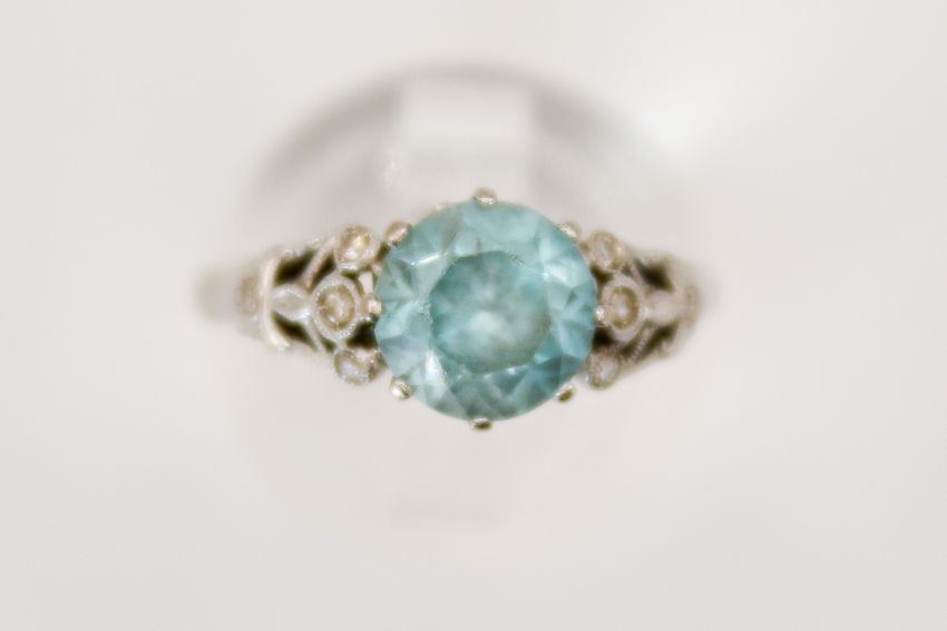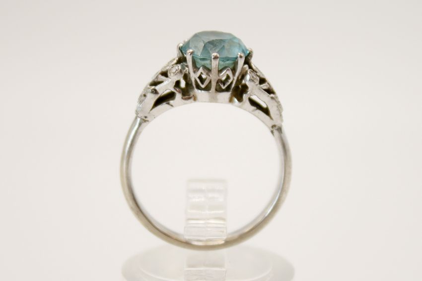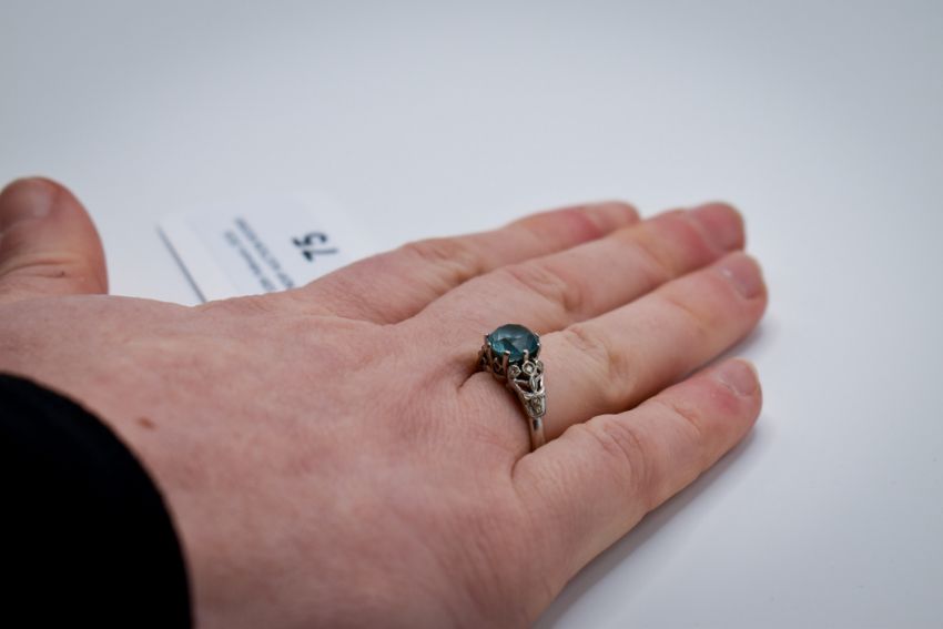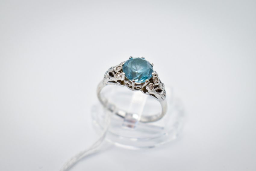 An 18ct gold and blue zircon ring. The round faceted stone 7.6mm diameter, in a white gold setting marked 18ct. Size M, gross weight 4.6g.