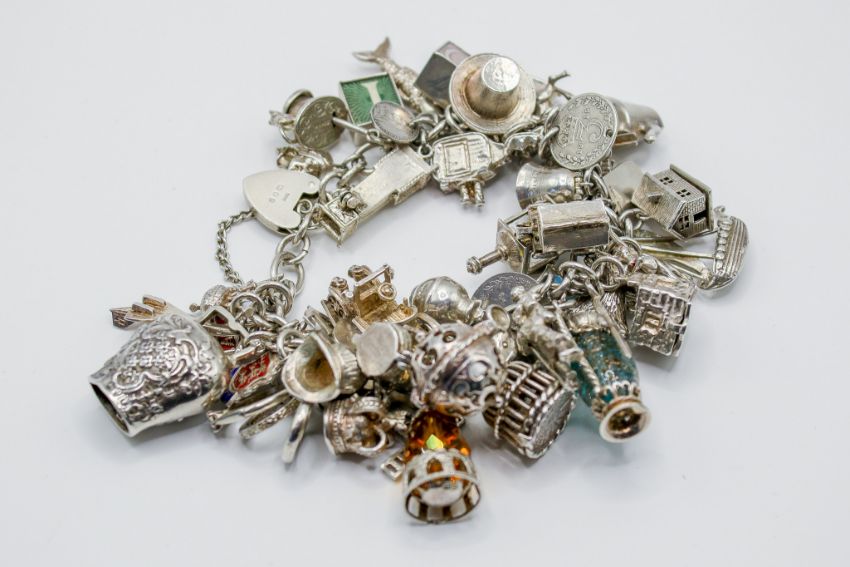 A silver charm bracelet with numerous silver and white metal charms. Charms include Concorde, Scotty dog, fish, motor car, etc, two with coloured beads, most hallmarked, marked 925 or silver. Gross weight 186g.