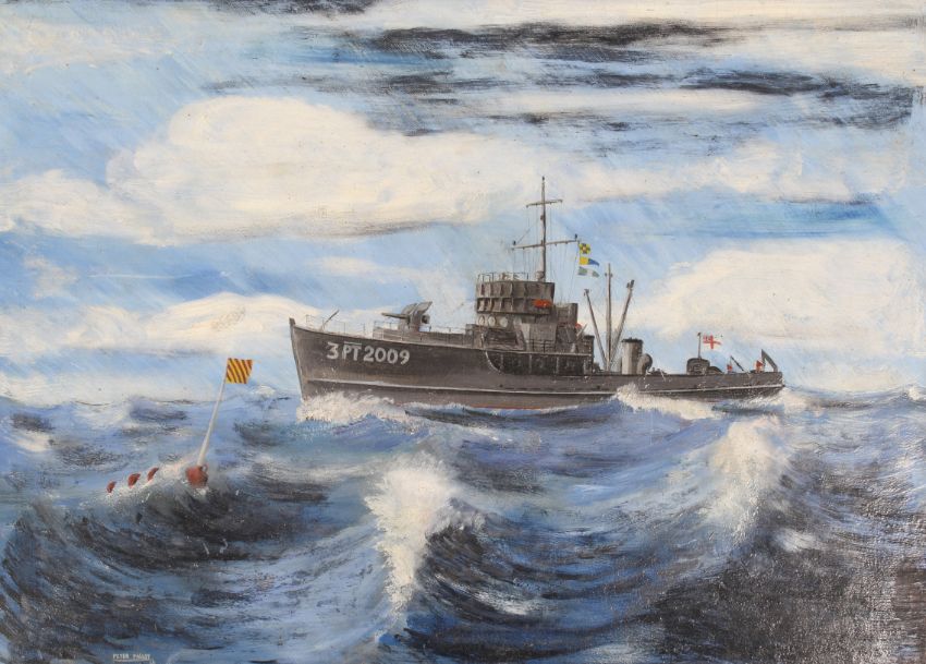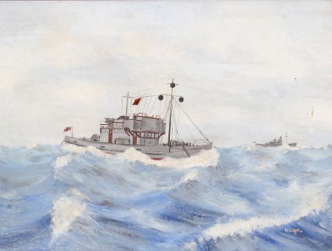 Peter Pallot (British, 1910-2012), two oils on boards, military ships at sea. Both signed and dated '46', 44cm x 33cm, framed, 52cm x 41cm.