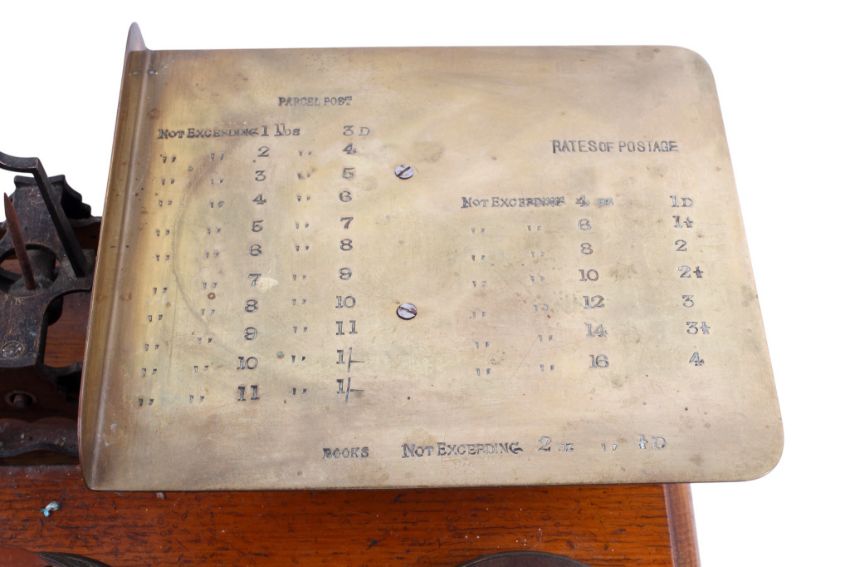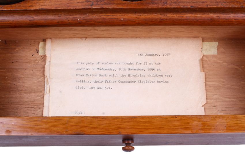 A set of Parkins & Gotts brass postal scales and weights. Fitted to an oak box with a single drawer, on bun feet, length 43cm.Provenance: A letter indicates that this pair of scales was purchased in 1956 from Ston Easton Park from the children of Commander Hippisley.