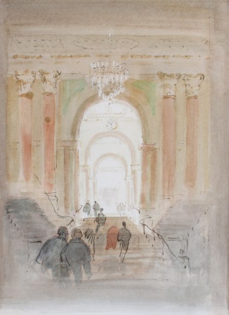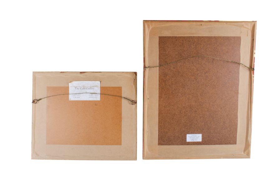 Two 20th century watercolours. Comprising a Frank Cox (1923), Mediterranean coast scene, signed (lower right), 20cm x 14cm, framed and glazed, 34cm x 29cm and an entrance hall, unsigned, 29cm x 21cm, framed and glazed 44.5cm x 34.5cm.