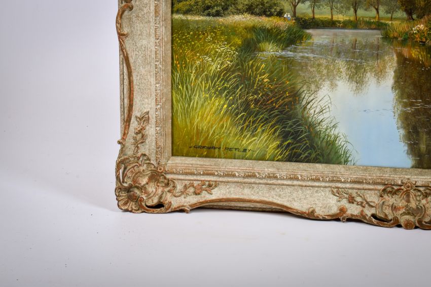 Graham Petley (1944-2025), oil on canvas, riverside landscape. Signed lower left, 90cm x 60cm, framed, 110cm x 80cm