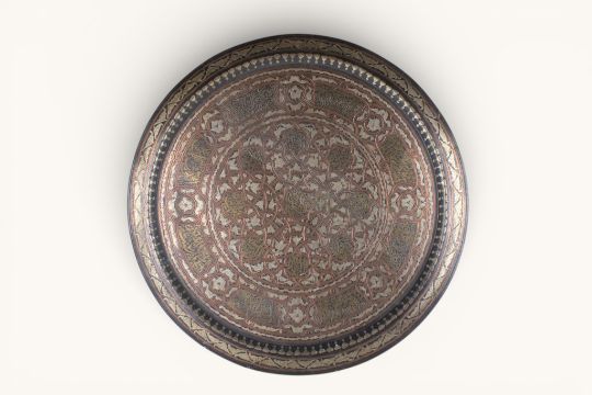 A large inlaid metal tray. Of circular form, with Islamic style decoration, Diameter 71cm