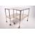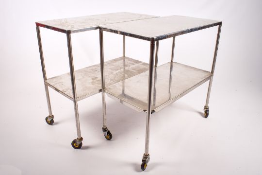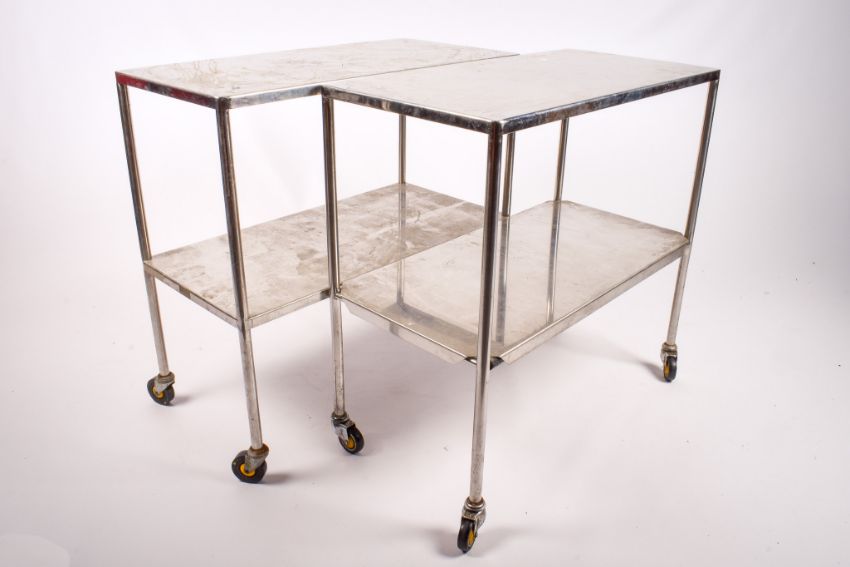A pair of industrial stainless steel trolleys. Having two shelves, mounted on wheels, H88.5cm x W91cm x D46cm.
