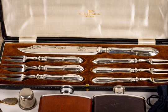 An assortment of collectables. Comprising a boxed Walker & Hall Ltd silver plated cutlery set, a Neolithic arrowhead (with paperwork), silver toothpick, 4.5g, three stainless steel and pewter hip flasks and a boxed set of Links London white metal cufflinks.