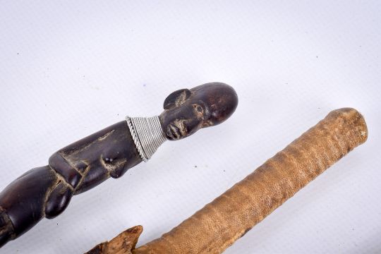 A group of five assorted ethnographic items. Including an African hand carved fly swat, etc. Longest 69cm