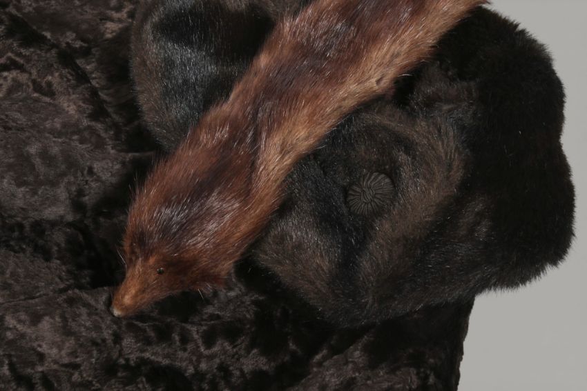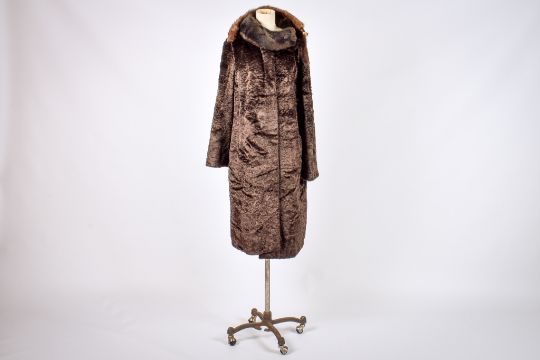 A circa 1960 Jontique faux fur coat and a mink scarf. The three quarter length coat with a purple lining and an internal label, shoulder width 57cm, length 107cm, the scarf, lenth 70cm