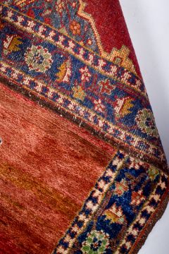 A 20th century woollen runner. Having a central green medallion on a red ground, within a blue, brown and green floral border, cream tassels to either end, 86cm x 282cm.