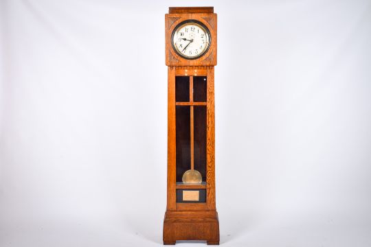 A 1920s Art Deco oak long cased clock. The white painted dial with Arabic numerals, marked 'H.A.C.', the glazed door exposing the pendulum, raised on bracket supports, H179cm x W37cm x D20cm.