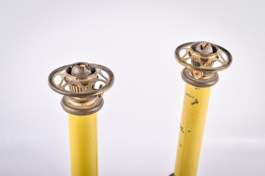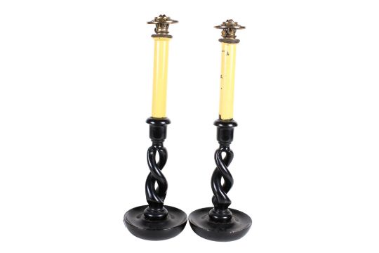 A pair of oil lamps modelled as candlesticks. With ebonized twist bases. H38cm