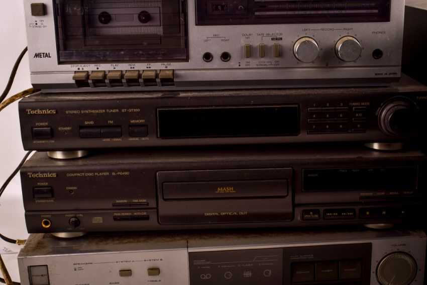 A group of five vintage items of hi-fi separates music equipment. Including an Akai AM-A1 amp, Sharp RT-100 cassette deck and a Bose PS28 III speaker, etc. Largest H33cm