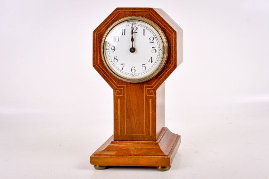 A early 20th century inlaid mahogany cased balloon style mantel clock. Having a white dial with Arabic numerals. H23.5cm