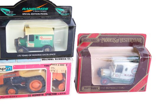 Eight diecast model vehicles. Including a Kubota Excavator and Tractor, Lledo Days Gone and Matchbox.