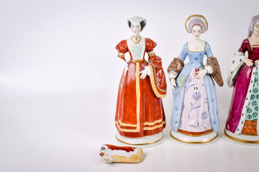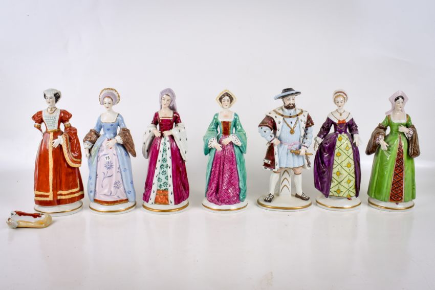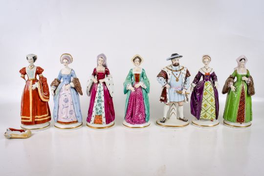 An early 20th century Sitzendorf porcelain figure group. Modelled as Henry VIII and his six wives (one af). Largest H20.5cm