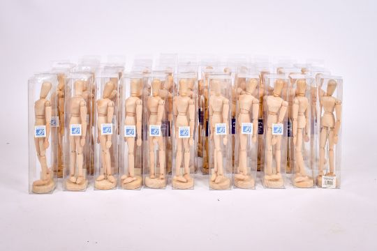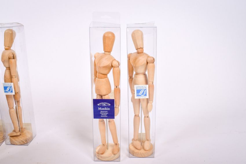 A collection of Windsor and Newton and Lefranc & Bourgeois artist wooden mannequins. With articulated joints, new in individual boxes. H33cm