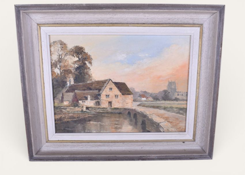 A 20th century oil painting. Signed 'E J Wilson', depicting a cottage beside a river, 16.5cm x 22.5cm, framed 25.5cm x 32cm.