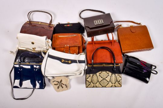 A large collection of vintage handbags. Including a Holmes faux snakeskin handbag, a brown leather satchel, a blue patent leather handbag, etc.