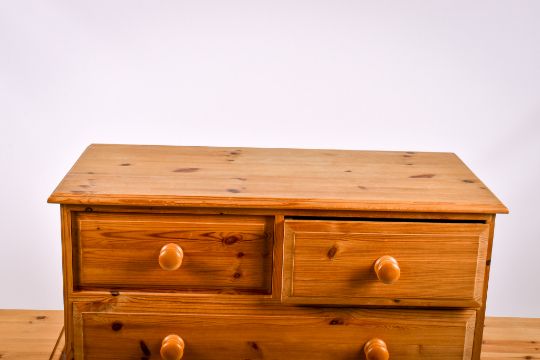 A contemporary pine chest of drawers and a pair of bedsides drawers. The chest having two short over four long drawers raised on a plinth base H112cm x W89cm x D42cm, the bedsides consisting of three drawers, H68cm x W43.5cm x D40cm.