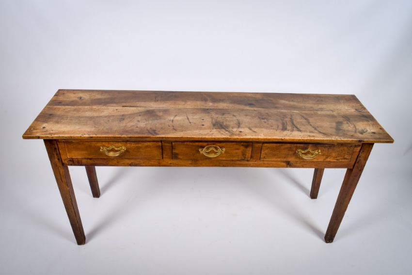An 18th century Georgian oak sideboard or dresser base. The rectangular top over three drawers with pierced brass handles, raised on square tapered supports, H75cm x W162cm x D44.5cm.