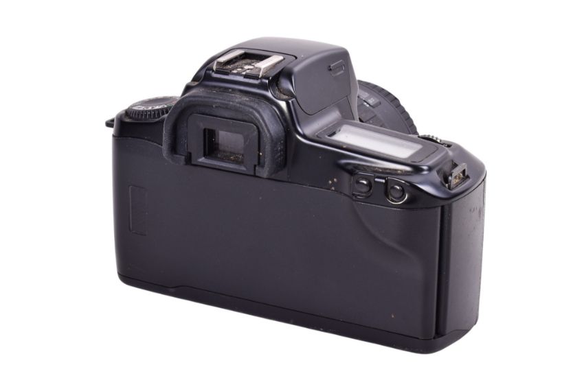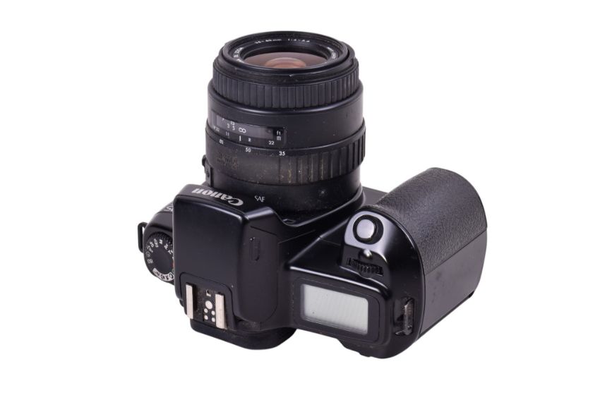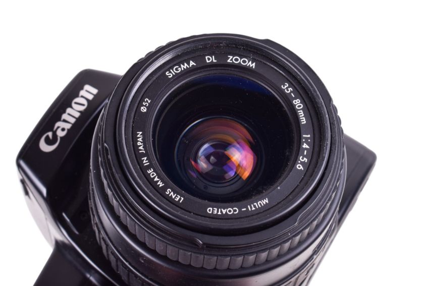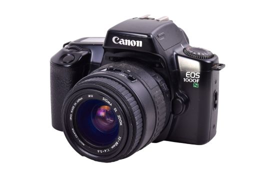 A Canon EOS 1000F N 35mm SLR camera. With a Sigma DL Zoom 35-80mm f4-5.6 lens, optics G. Powers on, shutter working.