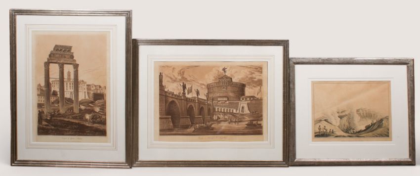 Three 19th century aquatints. Comprising J. Gleadah, 'Bridge and Fort of St Angelo', J. Gleadah, 'Temple of Jupiter Stator' and 'Crater in the Island of Volcano', largest 47cm x 33cm, framed and glazed 66.5cm x 51cm.