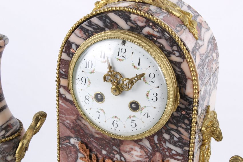 A late 19th century French marble mantel clock garniture set. The clock having a domed case topped with a gilt metal bird and decorated with applied cast metal embellishments, mounted on a plinth base with brass supports. The white enamel dial having Arabic numerals and painted with flowers, the striking movement marked 'C. H. Paris', H40cm. Flanked by a pair of matching urns with gilt metal handles and square bases, H28cm