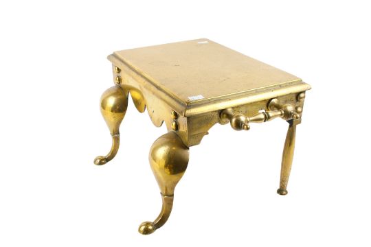 A 19th century heavy cast brass footman. The rectangular bevelled edge top over a deep, fretwork frieze and twin turned handles to the sides, raised on cabriole style front legs and turned back legs, H27cm x W41cm x D28cm (excluding handles and feet)