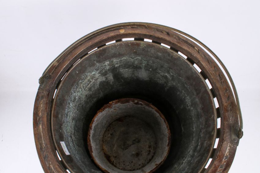 An Edwardian inlaid mahogany jardiniere stand. The circular tapering pot having a carved rim and fitted with a metal liner, mounted on a turned baluster support and a tripod base decorated with flowers, raised on bun feet, H51.5cm.
