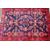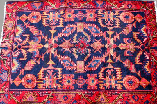 A 20th century Persian Hamadan rug. The central panel featuring a geometric pink, orange and brown pattern against a blue ground, surrounded by a red and blue geometric floral border, cream tassels to either end, 153cm x 106cm.