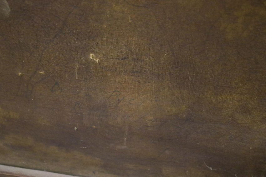 Extensive craquelure, paint losses, small holes, and tears to centre. Stretcher indentation inside the edge.