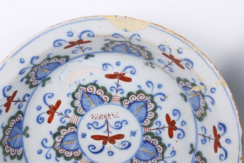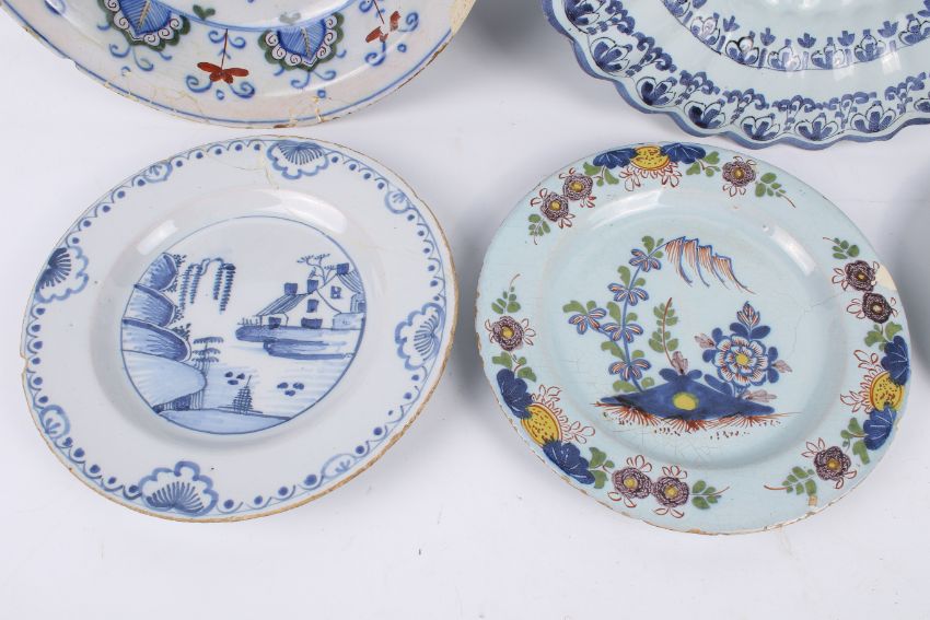 A collection of 18th century Delft dishes and plates. Including an English plate decorated in a blue and white image of a landscape, Diameter 23cm, a Lambeth plate, tin glazed with a faience polychrome floral pattern, Diameter 23cm, a rosewater dish with a fluted rim, Diameter 34cm, etc.