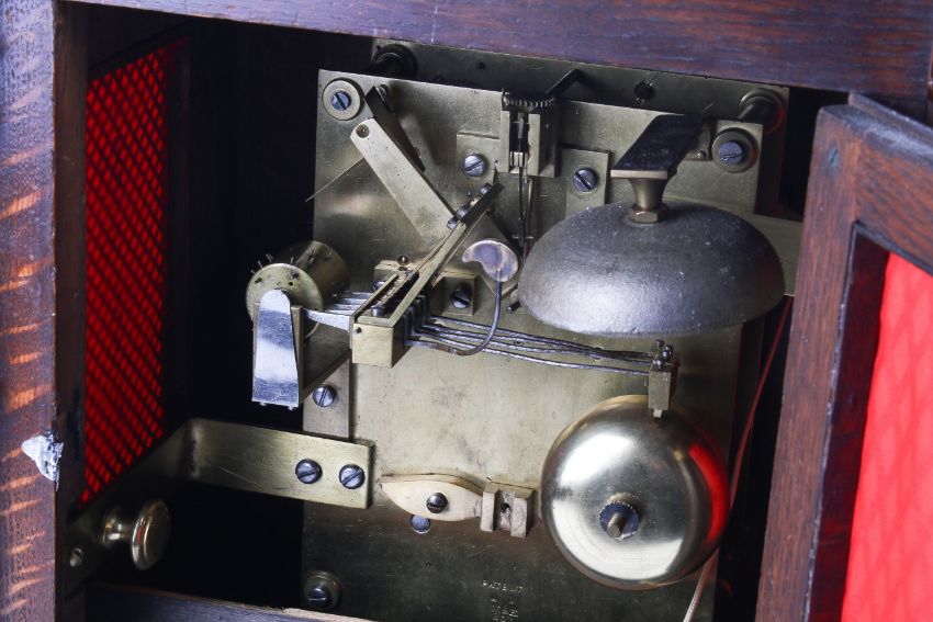 Doesn't appear to be functioning, there is a crack in the wood above the dial, surface marks and scratches conducive with use. No key
