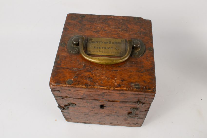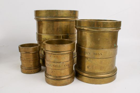 A boxed set of Country of Surrey District C Imperial Gill brass measures. Of cylindrical form with the measuring increments marked to the exterior, contained within an oak case with a brass handle and plaque to the top, H18cm.