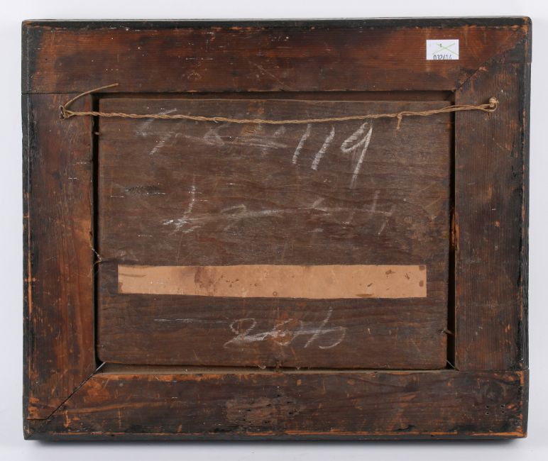 A late 18th/early 19th century oil on board, farm animals in a barn. Unsigned, 21cm x 28cm, framed, 35cm x 42cm.