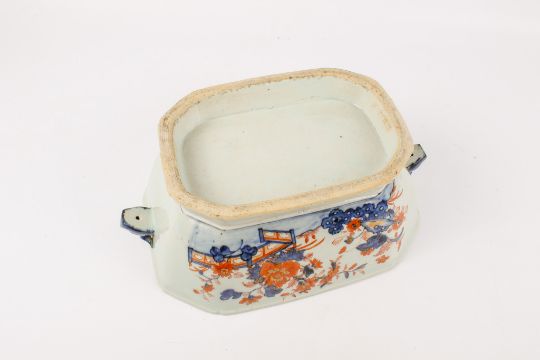 A late 18th century Chinese export dish, without lid. Having gilt and Imari decoration of flowers in a garden to both sides, and with animal head handles, unmarked. H13cm x W35cm x D22.5cm.