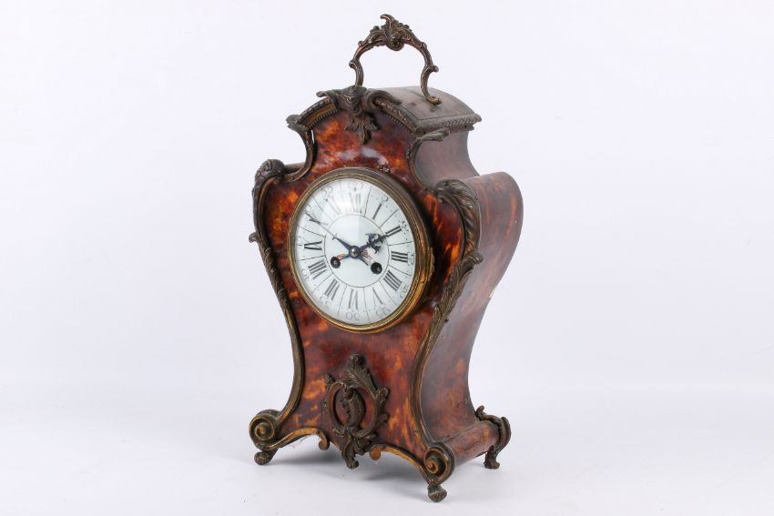 A late 19th century French mantel clock. The tortoiseshell covered case of cartouche form with scrolling cast gilt metal mounts, the white enamel dial with Roman numerals and Arabic numerals every five minutes, inscribed 'V Depose' at six. The mechanical clockwork movement having a half-hour strike on tone stick, marked 'Vincenti & Cie Medaille D-Argent 1855', H42.5cm.