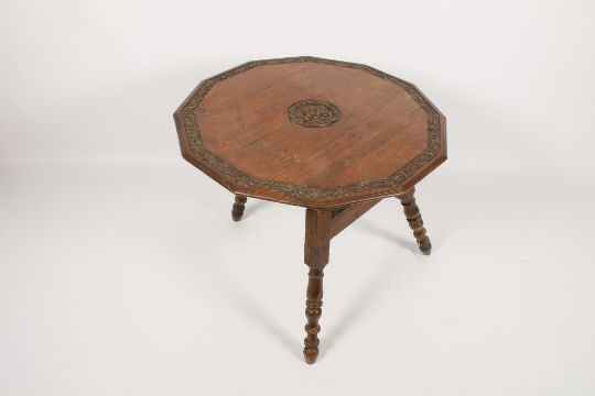 A possibly 18th century carved oak gateleg table. The separate twelve sided top carved with a scroll border and central putti roundel, the tripod gateleg base carved with deep grooves and scrolls, H69cm x Diameter 86cm.