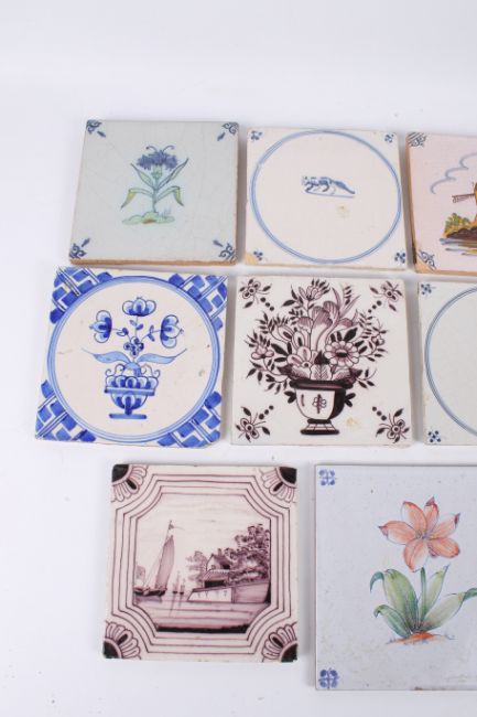 A collection of Delft ceramic tiles. Likely 18th century and later, of various designs, including a polychrome example depicting a windmill, a blue and white example depicting a camel, a purple and white example depicting a landscape, etc.