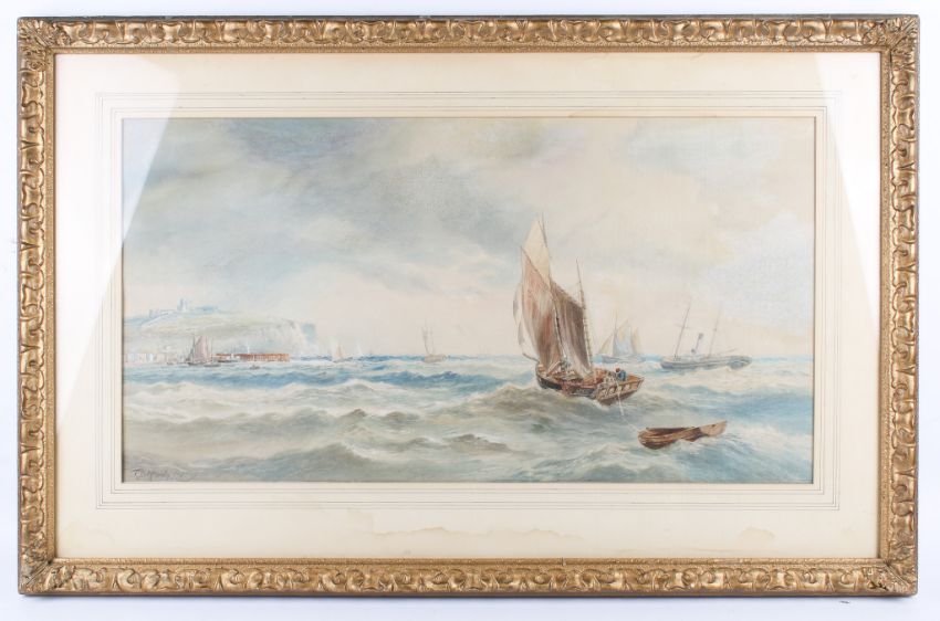 Thomas Bush Hardy (1842-1897), watercolour, boats approaching the cliffs of Dover. Signed and dated '78 lower left, 37cm x 71cm, framed and glazed 59.5cm x 92cm.