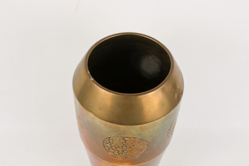 An Art Nouveau brass WMF hammered vase. Of tapered cylindrical form, decorated with circular motifs, impressed marks and numbered '151' to the base, H32cm.