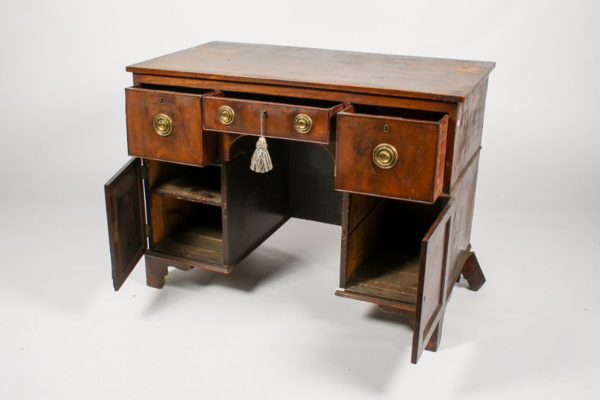 An early 20th century mahogany kneehole twin pedestal desk. Fitted with three drawers, with brass ring handles, over two panelled door cabinets, raised on bracket supports, H82cm x W110cm x D59cm.