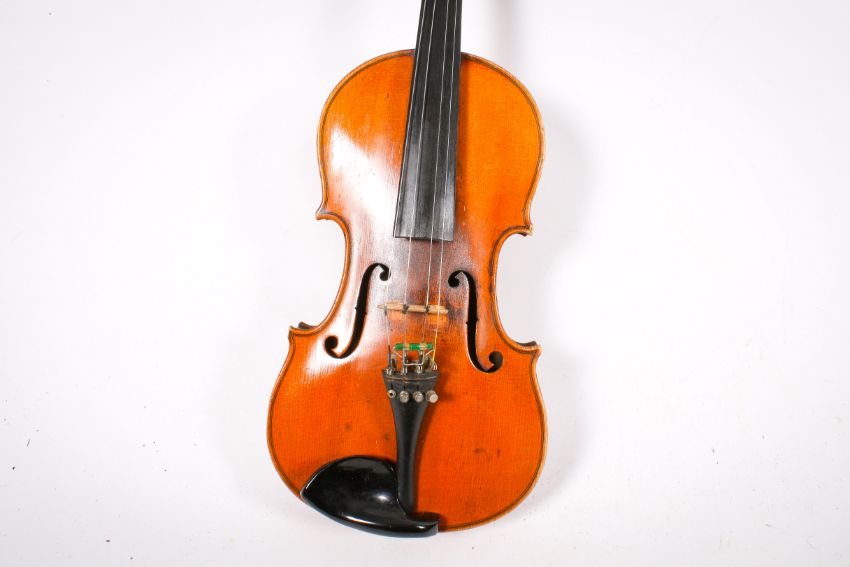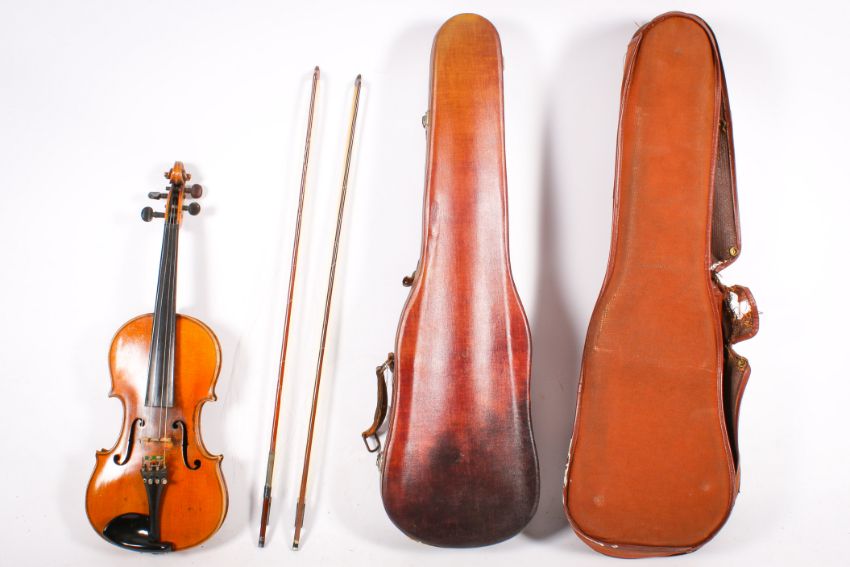 An early 20th century violin with two bows and case. Unlabelled, a 358mm two piece back.